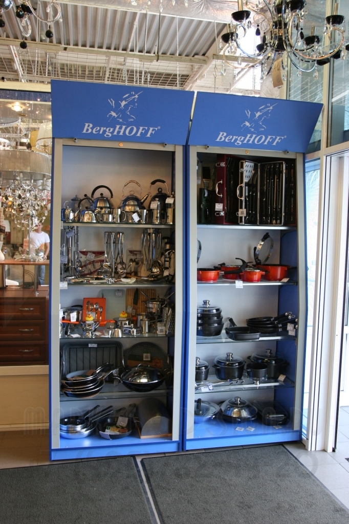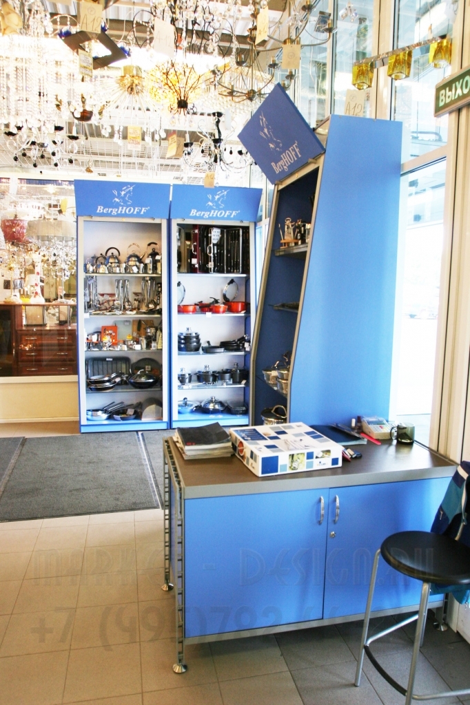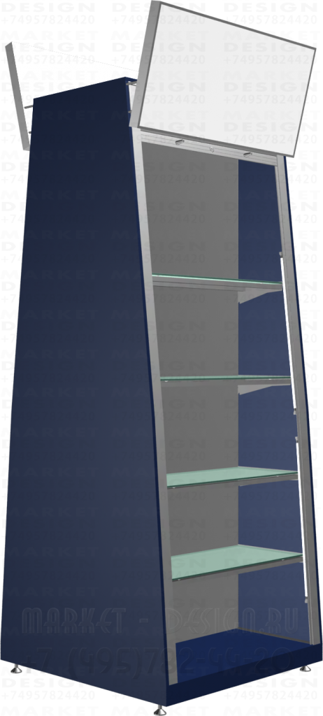 Дополнительная можно укомплектовать световым лайтбоксом для размещения графической информации , зеркальной задней стенкой ,подсветкой каждой полки, торцевой подсветкой справа и слева на боковых стойках, также можно место стандартных полок можно установить полки из металла.