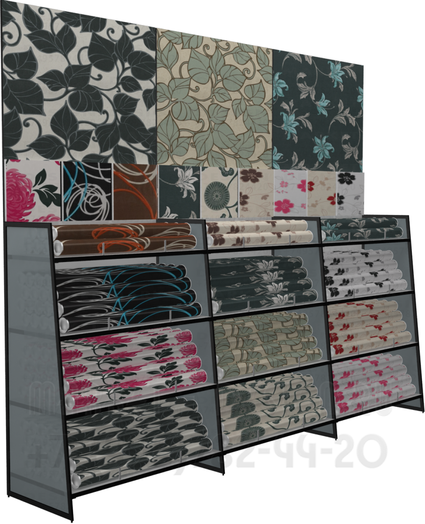 Односторонний стеллаж для обоев с высокой задней стенкой для выклейки образцов с возможностью демонстрации и хранения руллонов серии Рулоннкин это универсальные стеллажи изготавливаются на основе металлического каркаса с окрашиванием порошковой краской (стандартный цвет каркаса черный ) возможно изменения цвета по каталогу RAL. полки и задняя стенка изготавливается из плиты ЛДСП