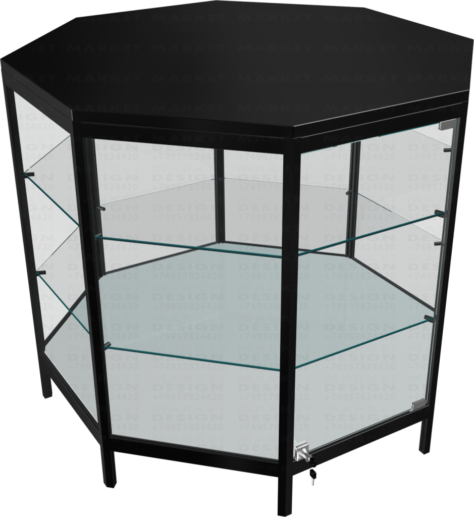 Металлическая витрина прилавок большой восьмигранник лофт серия LOFT модель VHR-19 изготавливается из алюминиевого профиля с вставками из плиты МДФ или ЛДСП , стекло 5мм с полированными краями. В стандартном исполнении в витрины устанавливают 2 стеклянные полки с возможностью регулировки по высоте, распашные стеклянные дверки, замок для распашных дверей.