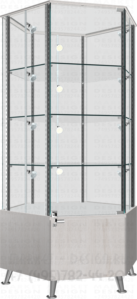 Усиленная витрина шестигранник серии УДАЧА модель В-14. В базовой комплектации шкаф оснащается замками, регулировкой полок по высоте, все внешние стеклянные части витрины изготавливаются из стекла марки м-1 толщиной 6мм, полки из закалённого стекла толщиной 8мм. все видимые торцевые части стекла с полированной кромкой (евро кромка). Нижняя и верхняя часть изготавливаются из мдф в сочетанием с плитой лдсп, комплектуется замками
