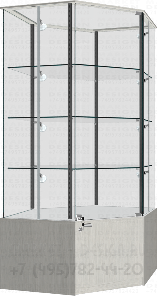 Угловая шестиугольная усиленная витрина серия ШПИНЕЛЬ модель В-10. В базовой комплектации шкаф оснащается замками, возможностью регулировать полки по высоте, все внешние стеклянные части витрины изготавливаются из стекла марки м-1 толщиной 6мм, полки из закалённого стекла толщиной 8мм. все видимые торцевые части стекла с полированной кромкой (евро кромка). Нижняя и верхняя часть изготавливаются из мдф в сочетанием с плитой лдсп, комплектуется замками.