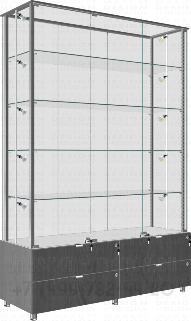 Витрина усиленная с стеклянном верхом и тумбой с выдвижными ящиками (выкатными) серии ПРИМАВЕРА. В базовой комплектации с возможностью регулировки полок по высоте, все внешние стеклянные части витрины изготавливаются из стекла марки м-1 толщиной 6мм, полки из закалённого стекла 8мм. все видимые торцевые части стекла с полированной кромкой (евро кромка). Нижняя и верхняя часть изготавливаются из мдф в сочетанием с плитой лдсп.