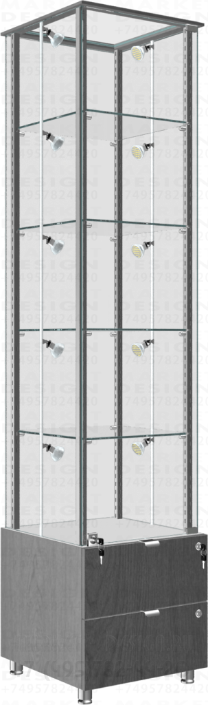 Витрина усиленная со стеклянном верхом и накопительной тумбой с выдвижными ящиками(выкатными) серии ПРИМАВЕРА. В базовой комплектации с возможностью регулировки полок по высоте, все внешние стеклянные части витрины изготавливаются из стекла марки м-1 толщиной 6мм, полки из закалённого стекла 8мм. все видимые торцевые части стекла с полированной кромкой (евро кромка). Нижняя и верхняя часть изготавливаются из мдф в сочетанием с плитой лдсп.