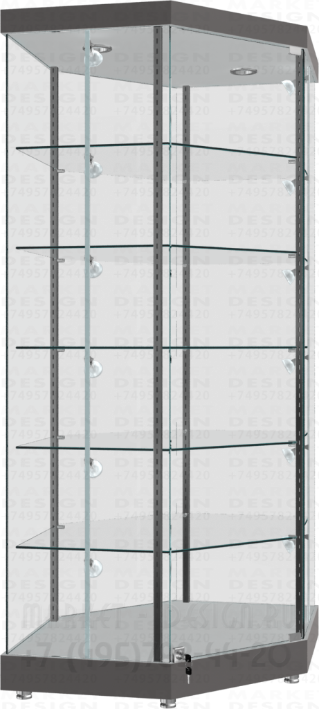 Усиленная угловая витрина для магазинов серии ПРИМА модель В-10. В базовой комплектации витрина оснащается возможностью регулировки полок по высоте, все внешние стеклянные части витрины изготавливаются из стекла марки м-1 толщиной 6мм, полки из закалённого стекла 8мм. все видимые торцевые части стекла с полированной кромкой (евро кромка). Нижняя и верхняя часть изготавливаются из мдф в сочетанием с плитой лдсп, комплектуется замками и подсевкой в вернем подиуме.