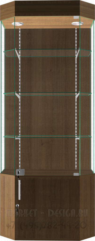 Глянцевая угловая витрина с подсветкой в боковых стойках
