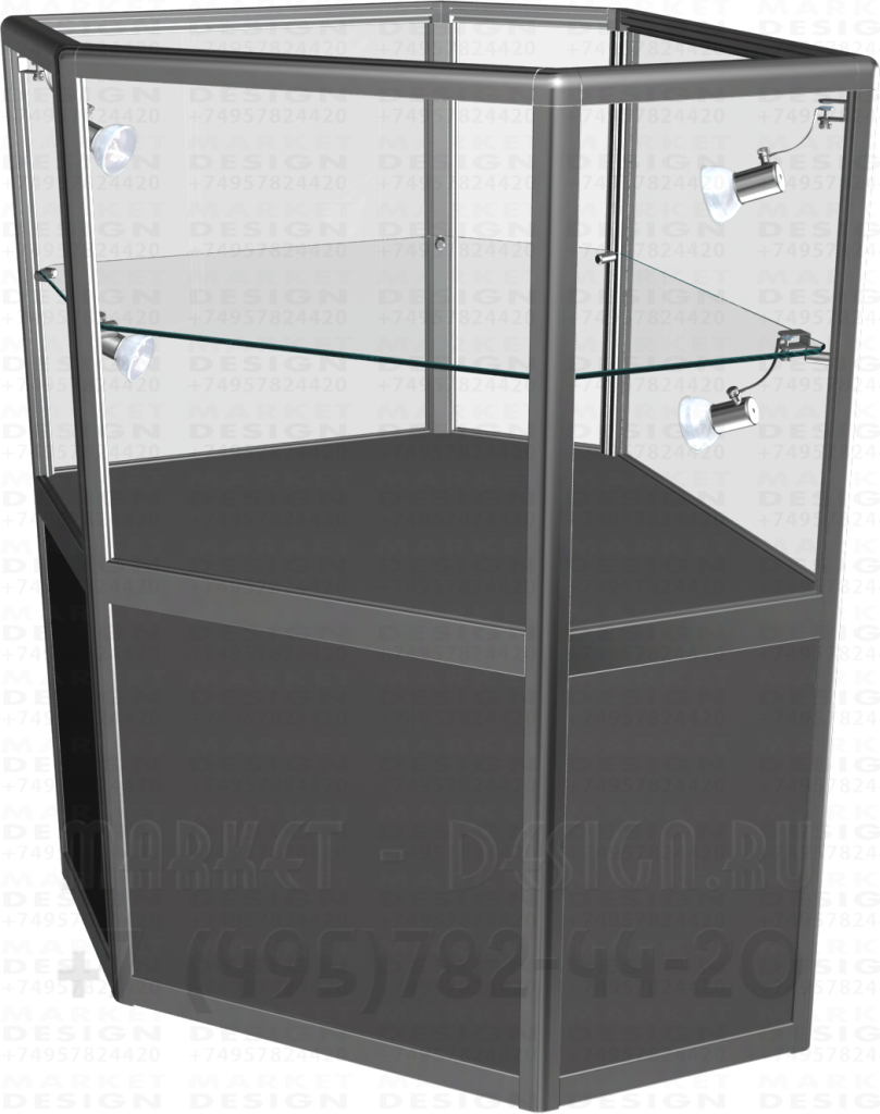 Прилавок шестиугольник из металлического профиля со стеклянной полкой серия Стандарт Эконом модель ПО-13. Все прилавки могут оснащаться точечной подсветкой или лампами дневного света. Комплектация прилавков возможна с раздвижными и распашными дверцами, возможна установка экопанелей. В производстве прилавков используется только лучшая фурнитура и стекло 6 мм.