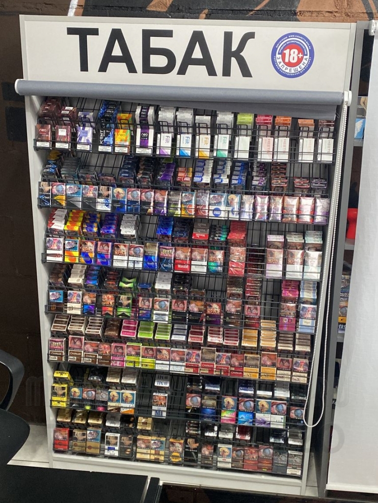 Торговый павильон для продажи табачных изделий с гравитационными шкафами.