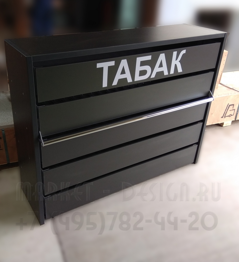 Настольный широкий шкаф для сигарет корпус изготавливается из ламинированной плиты дсп в сочетание с плитой мдф, все механизмы синхронизации и внутренняя фурнитура изготавливаются из стали окрашенной порошковыми эмалями. Данная модель поставляется в собранном виде, состоит из пяти полок по высоте, каждая полка комплектуется сигаретными ячейками из прозрачного пластика с подталкивающим устройством (пушерами) в которую можно установить 10-14 пачек по глубине, все дверки открываются и закрываются одновременно (заезжают под полку) на верхней створке устанавливается надпись табак, комплектуются хромированной ручкой которую можно отрегулировать по высоте.