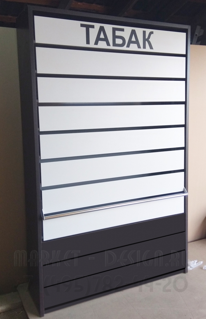 Сигаретный шкаф с выдвижными полками для хранения корпус изготавливается из ламинированной плиты дсп в сочетание с плитой мдф, все механизмы синхронизации и внутренняя фурнитура изготавливаются из стали окрашенной порошковыми эмалями. Данная модель поставляется в собранном виде, состоит из восьми полок по высоте каждая полка комплектуется сигаретными ячейками из прозрачного пластика с подталкивающим устройством (пушерами) в которую можно установить 10-14 пачек по глубине, все дверки открываются и закрываются одновременно (заезжают под полку) на верхней створке устанавливается надпись табак, комплектуются хромированной ручкой которую можно отрегулировать по высоте. В нижней части шкафа располагается подтоварная тумба с выдвижными ящиками для хранения складских остатков.