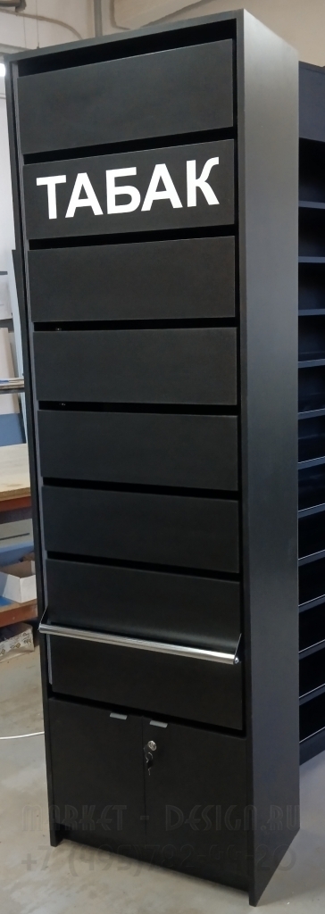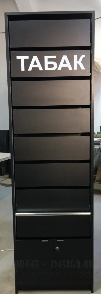 Синхронный сигаретный шкаф с тумбой под товар корпус изготавливается из ламинированной плиты дсп в сочетание с плитой мдф, все механизмы синхронизации и внутренняя фурнитура изготавливаются из стали окрашенной порошковыми эмалями. Данная модель поставляется в собранном виде, состоит из восьми полок по высоте, каждая полка комплектуется сигаретными ячейками из прозрачного пластика с подталкивающим устройством (пушерами) в которую можно установить 10-14 пачек по глубине, все дверки открываются и закрываются одновременно (заезжают под полку) на верхней створке устанавливается надпись табак, комплектуются хромированной ручкой которую можно отрегулировать по высоте. В нижней части шкафа располагается подтоварная тумба с распашными дверками для хранения складских остатков.